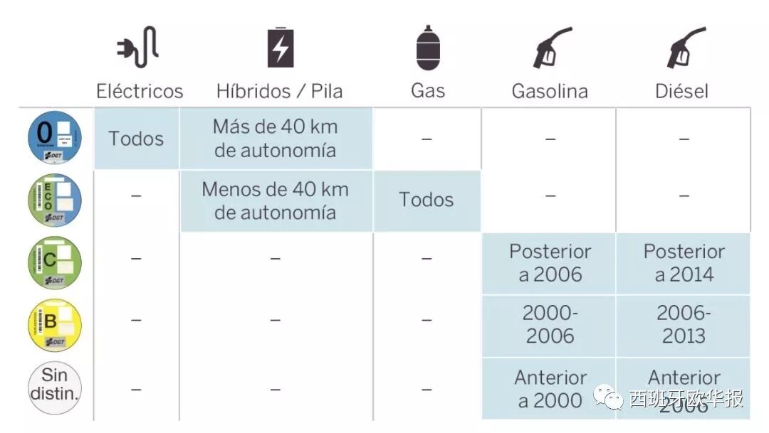 西班牙交通局的机动车环保标准规定,根据车辆的排放量,将车辆分为4个等级: