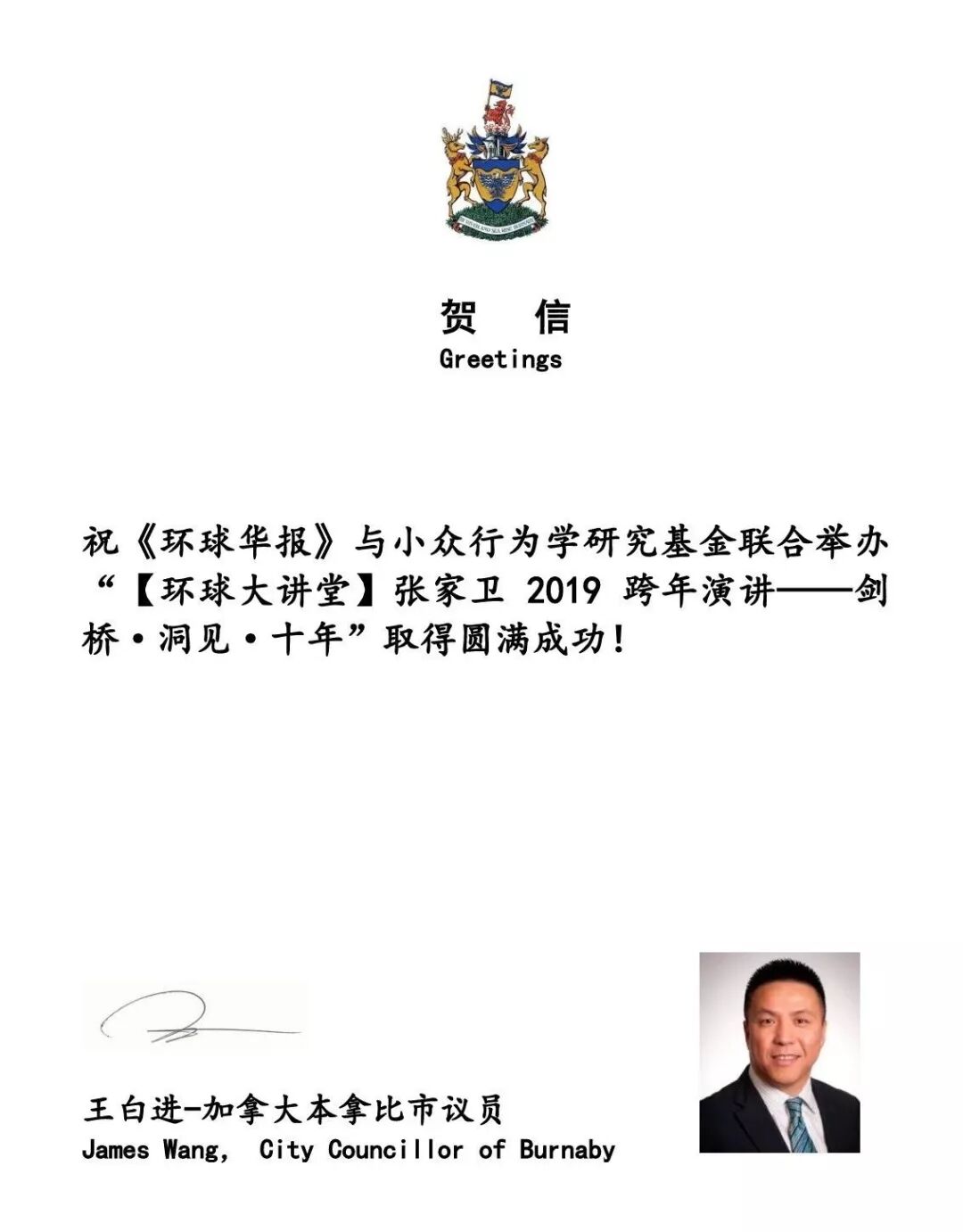 本拿比市议员王白进发来贺信