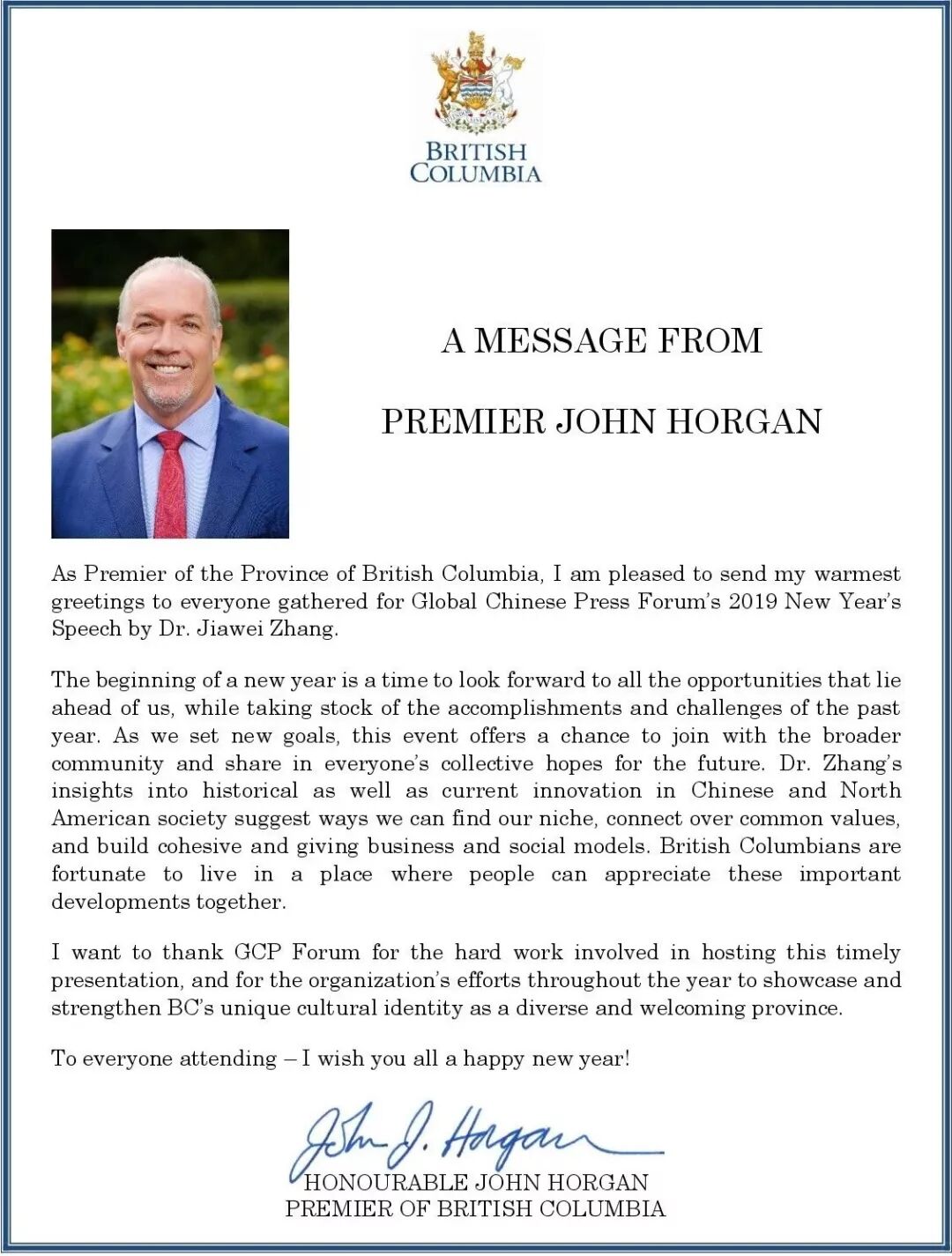 卑诗省省长贺谨发来贺信