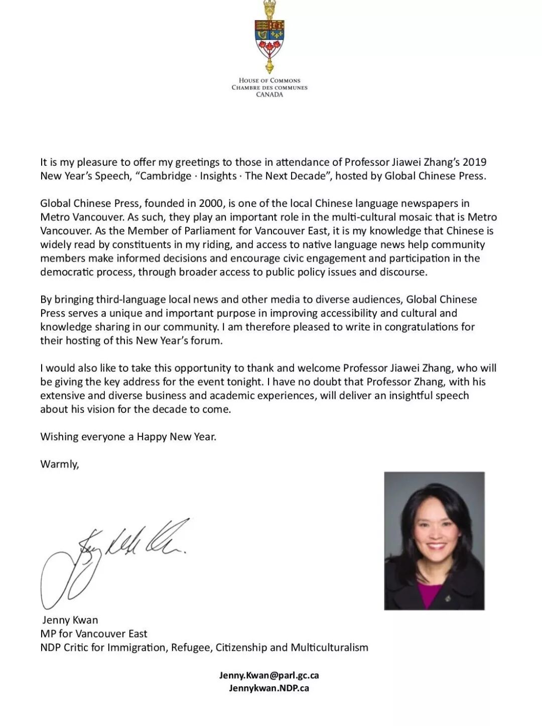 本次活动得到了三级政府的大力支持,卑诗省省长贺谨、国会议员关慧贞、省议员屈洁冰等政要虽未能到现场,但纷纷发来贺信,祝贺【环球大讲堂】张家卫2019跨年演讲顺利开讲并圆满成功。本拿比市议员王白进、香港经济贸易处驻加西首席专员袁黄洁玲、联合主席团、联合支持方,与温哥华各界精英人士,亲临现场聆听,坐无虚席。