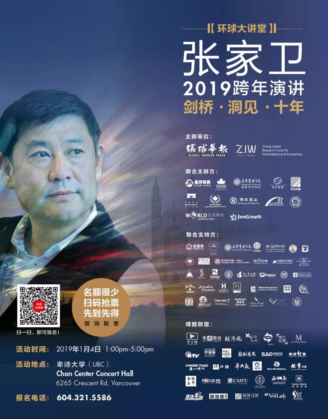 2019年1月4日,由加拿大环球华报传媒集团与小众行为学研究基金共同主办的“【环球大讲堂】张家卫2019跨年演讲——剑桥•洞见•十年”在学术氛围浓郁的加拿大温哥华不列颠哥伦比亚大学(UBC)Chan Centre 准点开讲。