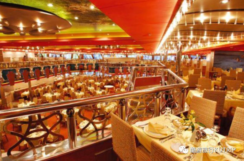 波多菲诺餐厅(免费):位于船中部,跨越两层甲板气势恢宏、装修典雅的西式主餐厅,免费提供各国美食。楼层: 3、4。