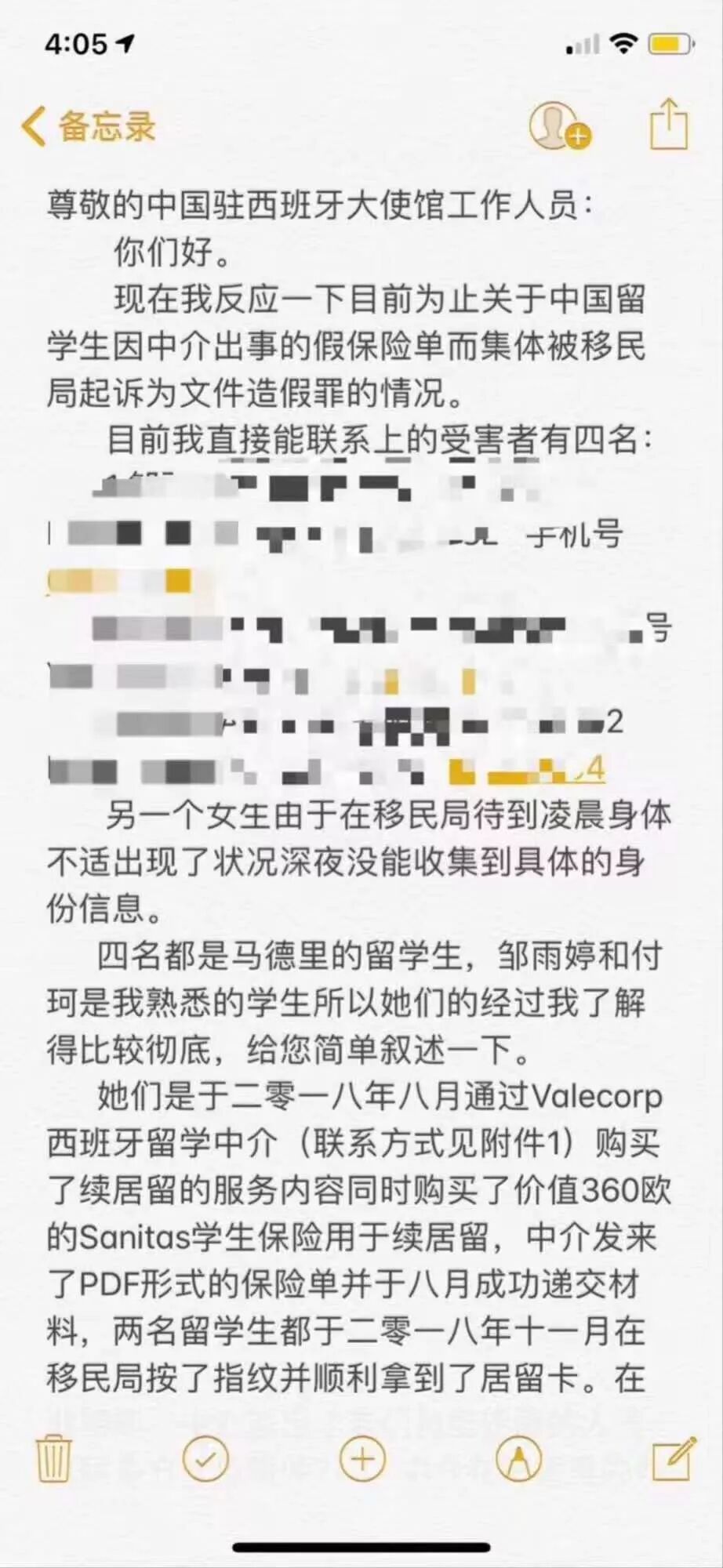这些留学生在续居留时递交了保险单,被移民局发现保险单是伪造的,警方立即把这些留学生“请”进警局调查讯问,不少学生因此受到惊吓,以下是一些留学生给使馆写的求助信,反映他们的遭遇。