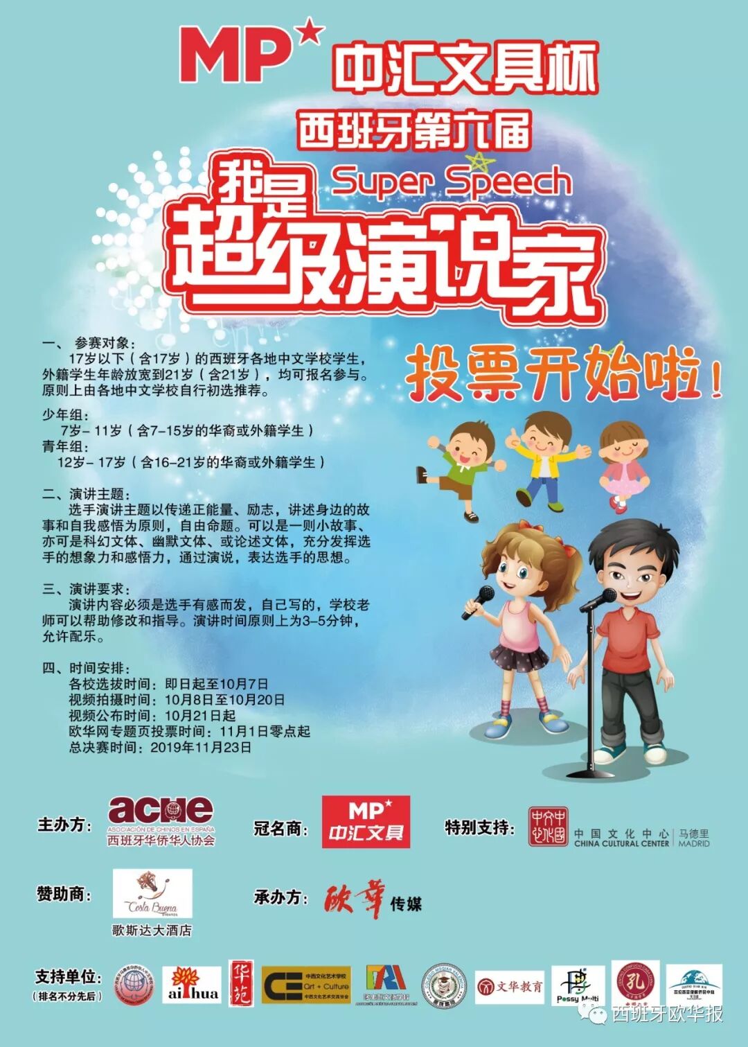 本次投票并不代表最终成绩,只是为参赛小选手们提供一个展现自己的平台。11月23日上午,第六届“中汇杯·我是超级演说家”总决赛将在马德里中国文化中心举行。