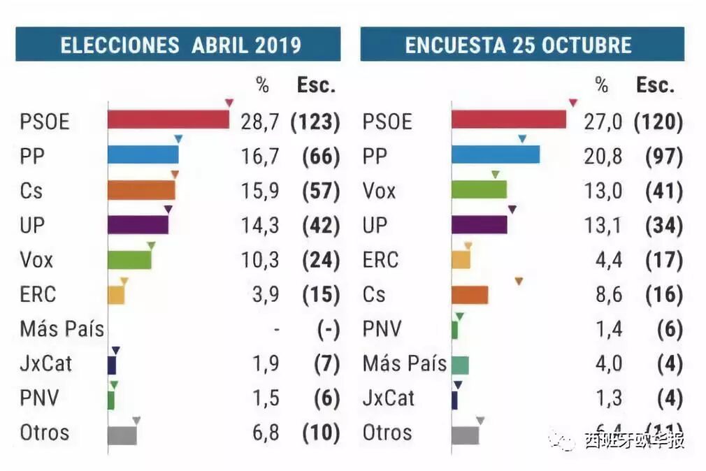 11月10日的大选,从民意调查上看会有一些变化,但却无法改变大的政治格局。左派我们能党的选票会被内讧另起炉灶的新党分流,支持率最高的社工党依然无法获得绝大多数,也依然无法和我们能党打成共识。右派人民党会占一点点便宜,但他们无法和VOX声音党联合。声音党是个浑身带刺的极端右派,谁和他站队都会倒霉。市民党之前还表示过要和声音党联合,结果遭到媒体集体炮轰。