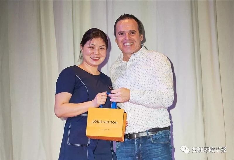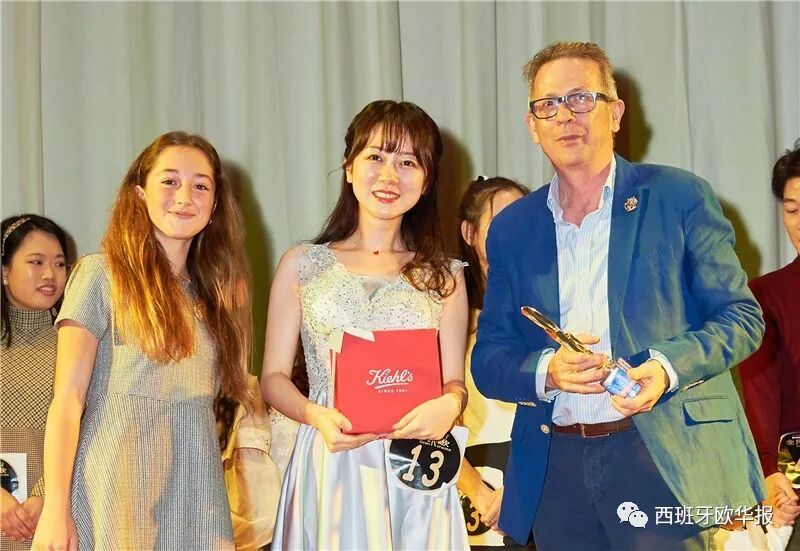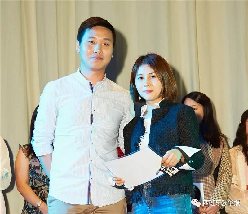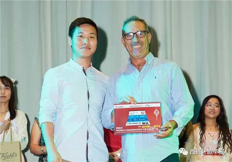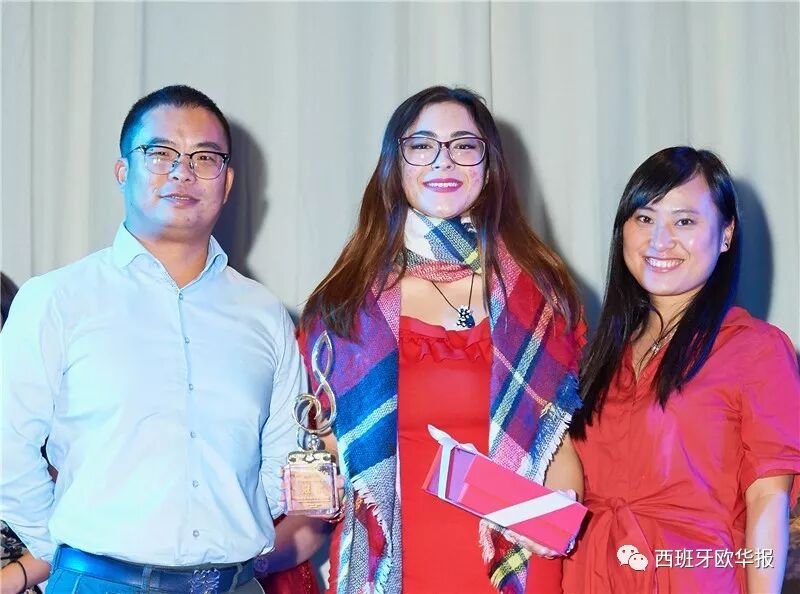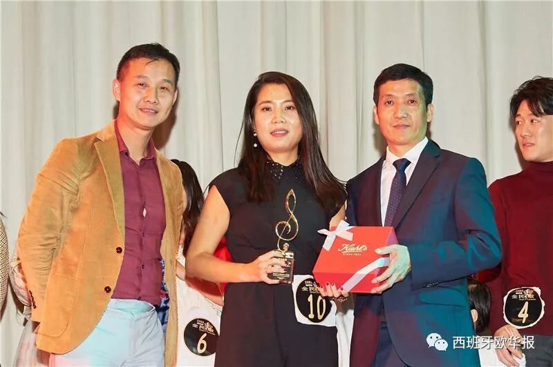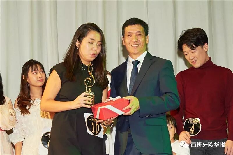 首先上台的是西班牙吉利西公司总经理陈文杰先生,他宣读了全民K歌比赛第三名:胡雅玲选手。随后,卡斯特利翁华侨华人总会周明亮会长上台为她颁奖。