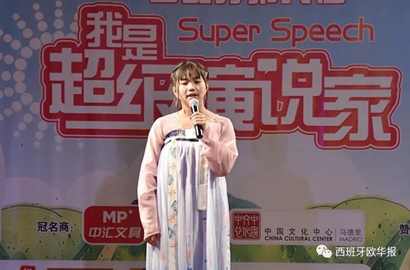 青年组选手中有一位女生很引人注目,她身着唐代齐胸襦裙,梳着古式发髻,乖巧动人,所有观众顿时都被她吸引。她就是来自瓦伦西亚墨谦书院的叶奕涵同学,她向大家娓娓道来汉字之美,从不同层面说明了汉字的意义,同时举了不同的例子展现传统的汉字之美,汉字就是一字一世界、一笔一乾坤的中国字。虽然她看起来腼腆含蓄,但是在台上她却表现得举止大方,语言自然流利,一袭汉服更是衬得她闪亮自信。