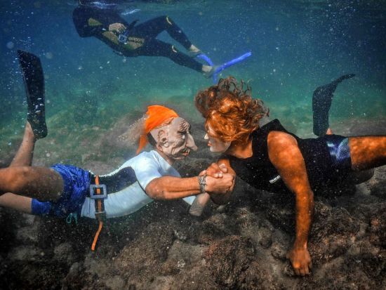 两个身着万圣节服装的人在黎巴嫩巴特伦市的海岸线上游泳时互动.IBRAHIM CHALHOUB/AFP