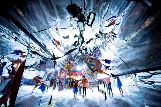 在加利福尼亚州洛杉矶伍德兰希尔斯举行的万圣节派对上,人们穿过扭曲的镜面隧道。ETIENNE LAURENT/EFE