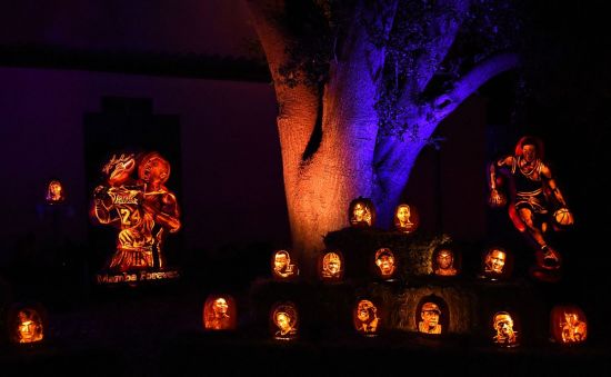 在加利福尼亚州卡拉巴萨斯的吉列国王牧场,利用南瓜雕刻出运动员的模样,包括致敬已故球员科比·布莱恩特(左)。LISA O'CONNOR/AFP