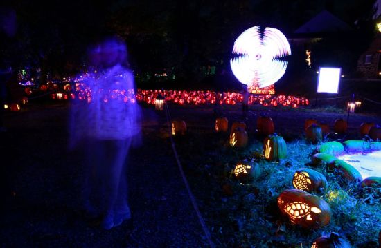 人们走过纽约哈德逊河畔克罗顿的发光雕刻南瓜。KENA BETANCUR/AFP