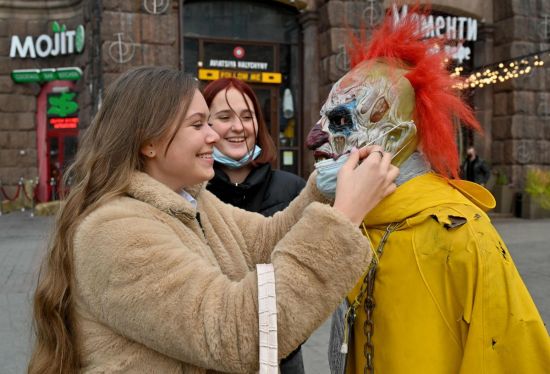 基辅两个年轻人给万圣节人体模型戴口罩。SERGEI SUPINSKY/AFP