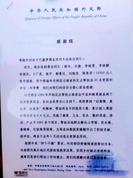 加泰罗尼亚北京同乡会会长韩杰在发言中感慨良多,感恩祖国。改革开放促进发展,给侨胞们带来走出国门创业的机会,才能有回报社会的条件。在言传身教下,他女儿,作为侨二代一员,也学会了献爱心,向贫困地区捐出了200欧元压岁钱。