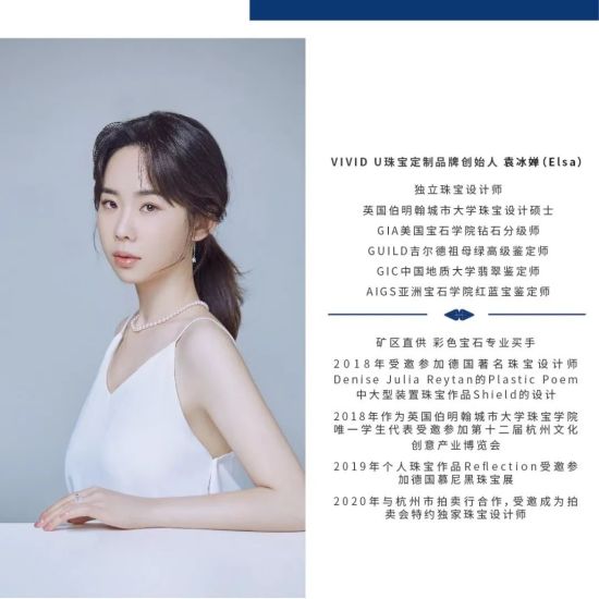袁冰婵,就读于英国伯明翰城市大学,获得珠宝设计硕士学位。之后,她又花费了两年时间,研究学习了国际最权威的珠宝鉴定课程,取得了钻石、红蓝宝石、祖母绿、珍珠及翡翠鉴定师资格。她的第一份工作是在杭州品牌公司做珠宝设计师。