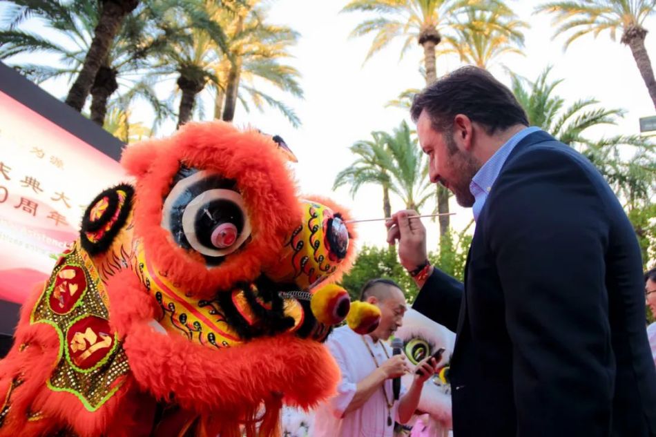 接着,一场令人振奋的舞狮表演点亮了整个庆典,由中西公益协会会长裘建胜先生和Elche市长Pablo Ruz先生为“金狮”点睛。这场舞狮表演象征着好运和祝福,也代表着中西公益协会将继续勇往直前。