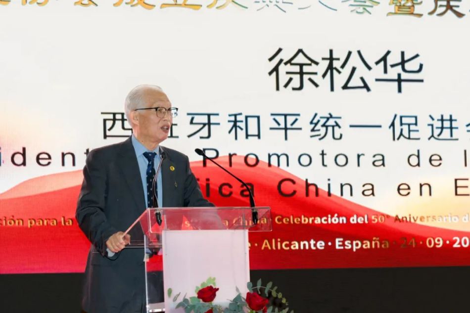西班牙和平统一促进会会长、中国和平统一促进会常务理事、中国侨联海外顾问徐松华先生上台发表讲话。徐松华先生表示:“在今天的盛会上,我们不仅庆祝了中国与西班牙建交50周年,也见证了中西公益协会的成立,展望着未来的美好。