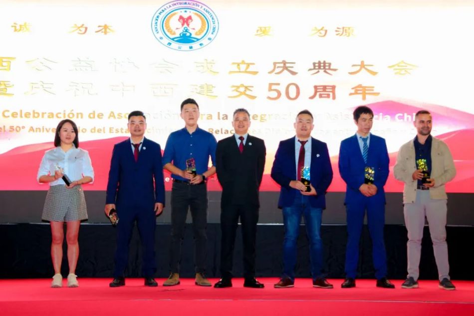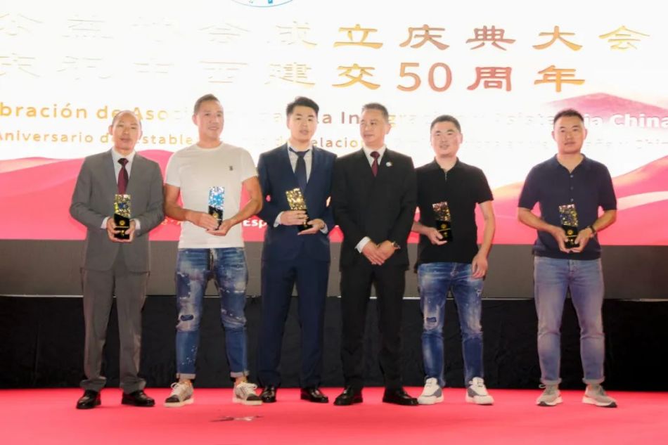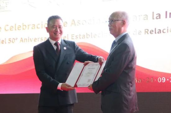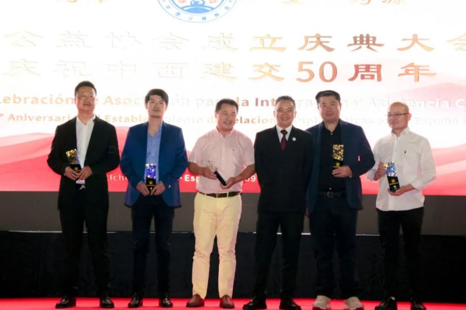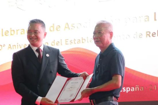 随后,西班牙和平统一促进会会长、中国和平统一促进会常务理事、中国侨联海外顾问徐松华先生也上台,将中西公益协会的会旗授予裘会长,这象征着协会的团结和奋斗。之后他们共同展开旗帜,记录下了这重要的瞬间。