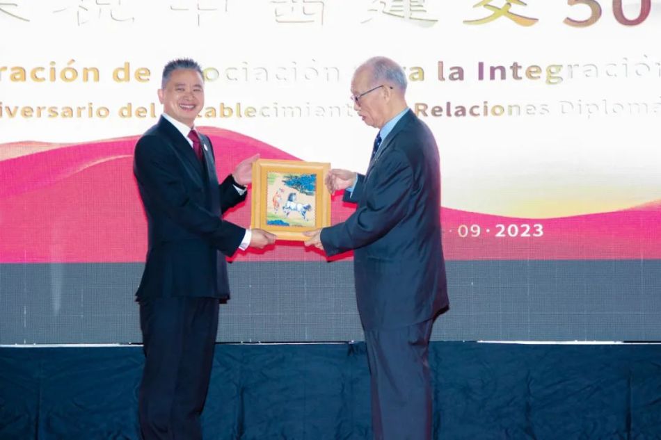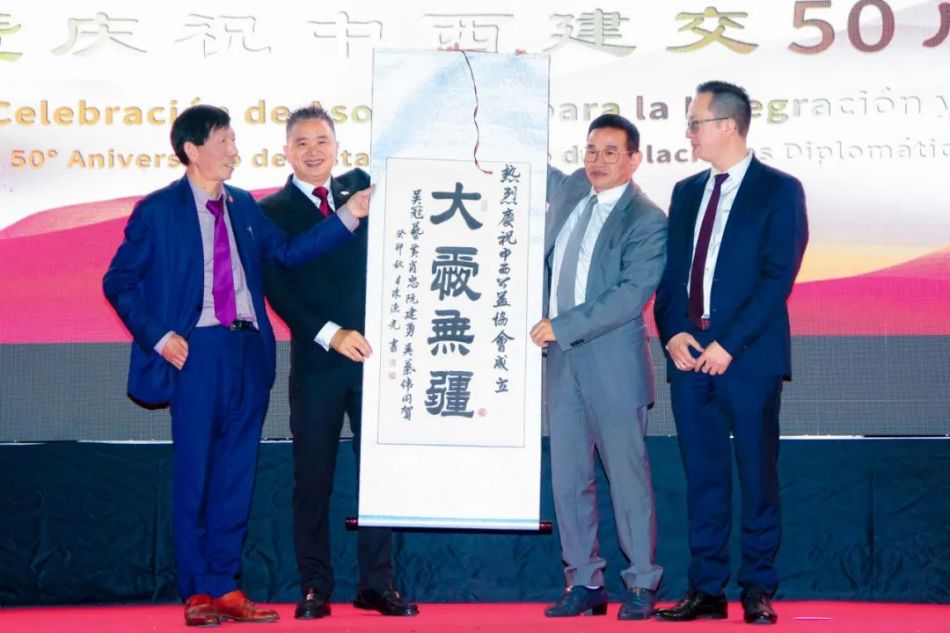 庆典的最后,西班牙华侨华人总会吴观艺会长、西班牙中西交流发展协会黄肖中会长和西班牙振兴中华协会叶吴伟会长为中西公益协会赠送一卷由西班牙书法家协会主席陈渔光书写的墨宝“大爱无疆”。西班牙和平统一促进会会长、中国和平统一促进会常务理事、中国侨联海外顾问徐松华先生为中西公益协会赠送一副《马到成功》。