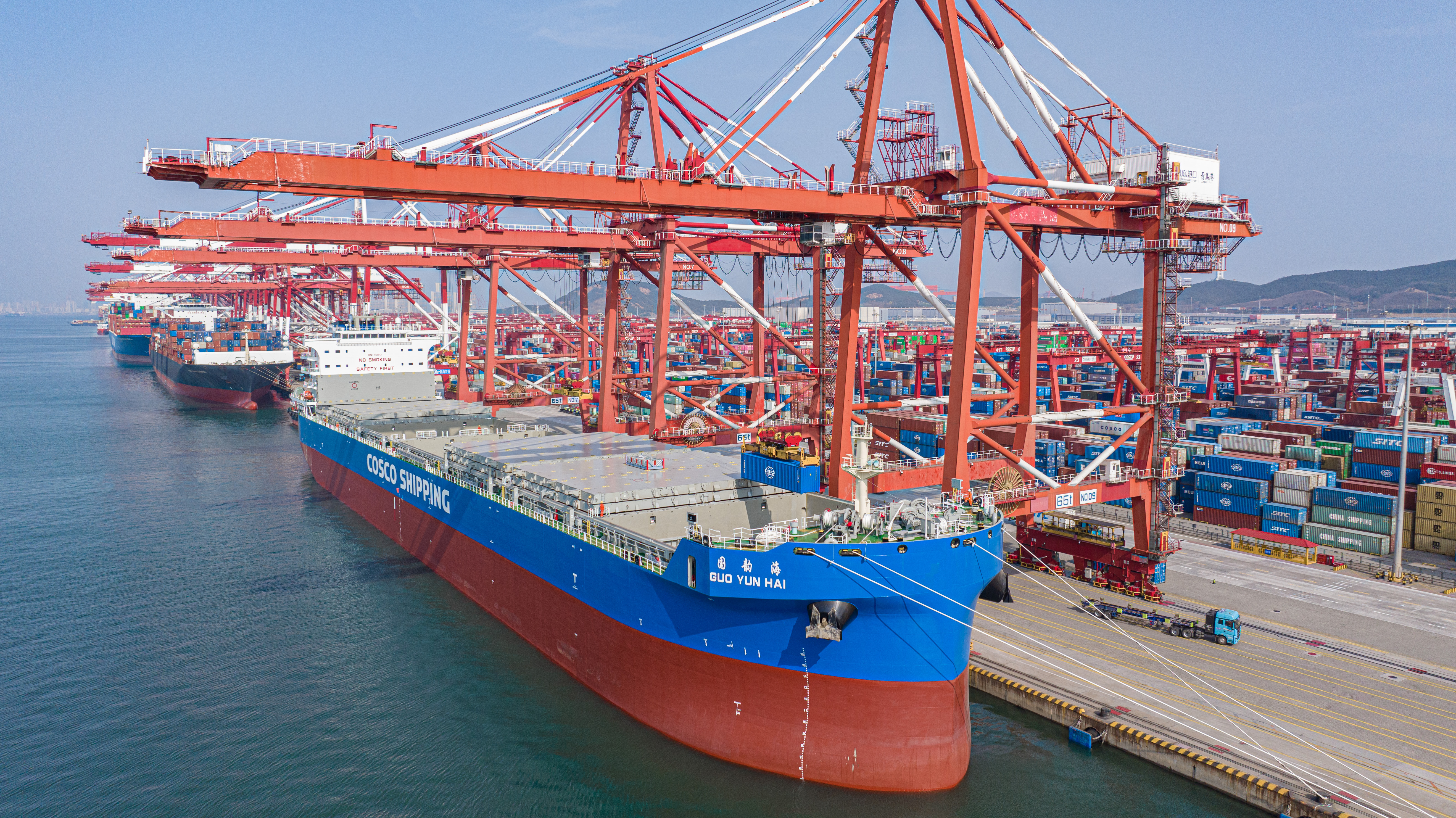 近日,在位于青岛西海岸新区的青岛港前湾集装箱码头,北非新航线首班船舶“国韵海”轮完成靠泊,装载606标准箱物资启航前往埃及、利...