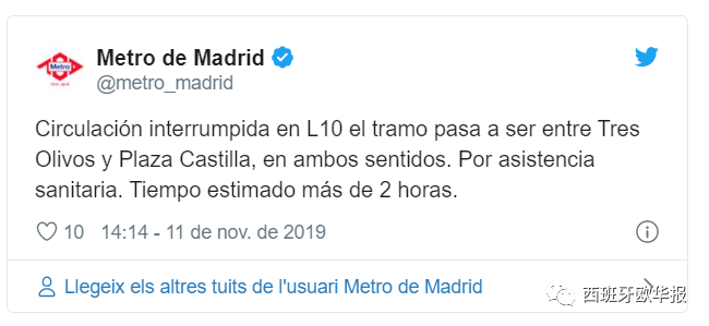 20 Minutos消息(编译 青峰) 昨日,马德里紧急救助中心在马德里地铁10号线的隧道内发现一名男性死者,这导致该线地铁服务不得不中断2个小时左右。